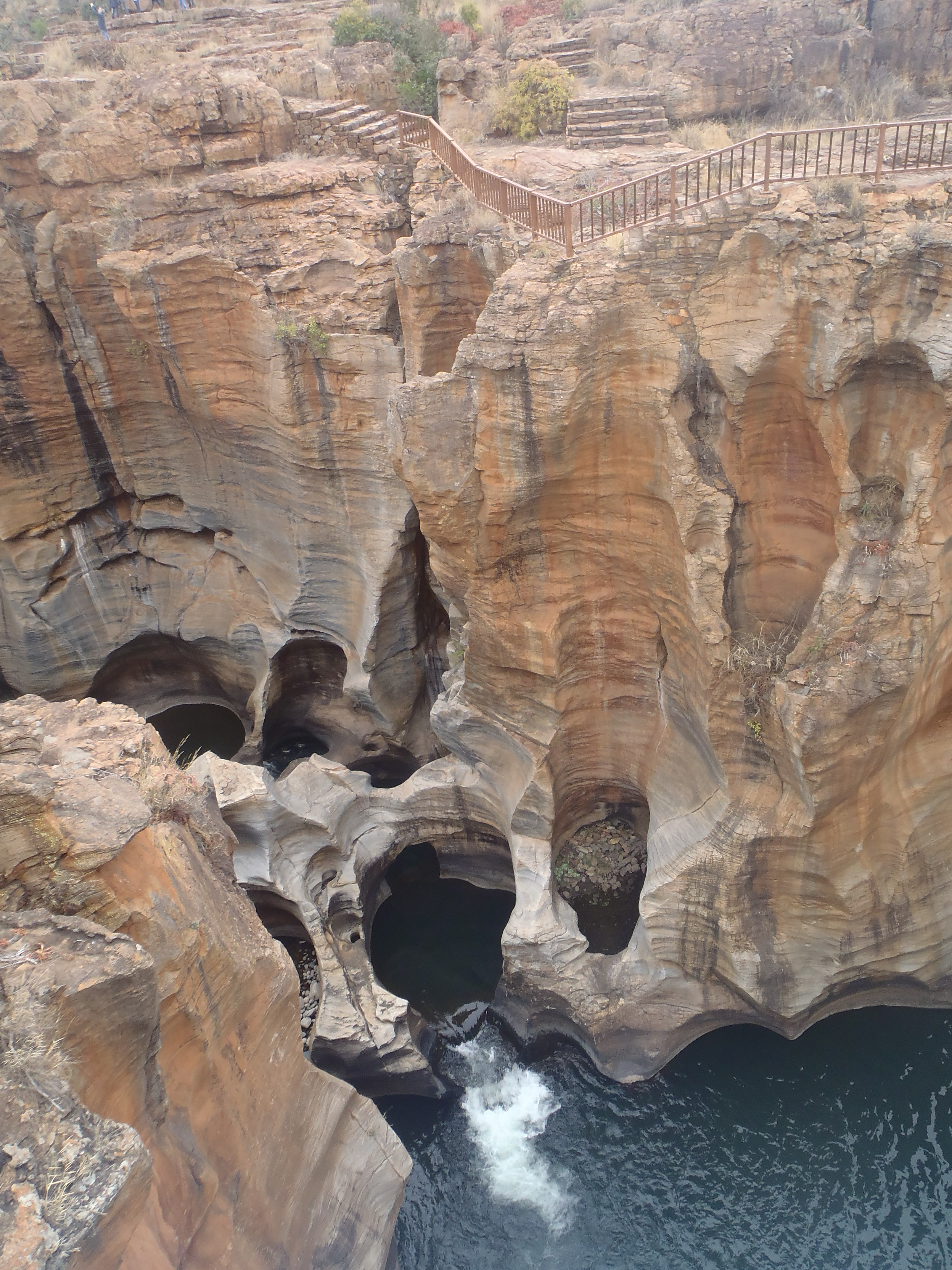 Laden with nick nacks I got back in my car and carried on further north, to Bourke’s Luck Potholes. These ‘holes’ are named after Tom Bourke, but were not made by him. Rather, they were created by the meeting of two rivers, the Treur and the Blyde. The swirls and eddies from the joining of these two waterflows over sand stone resulted in the most spectacular shapes carved out of the rock. There are a number of bridges which have been built over the canyons created by the water and despite the weather, I think my pictures turned out relatively similar to those on the post cards.