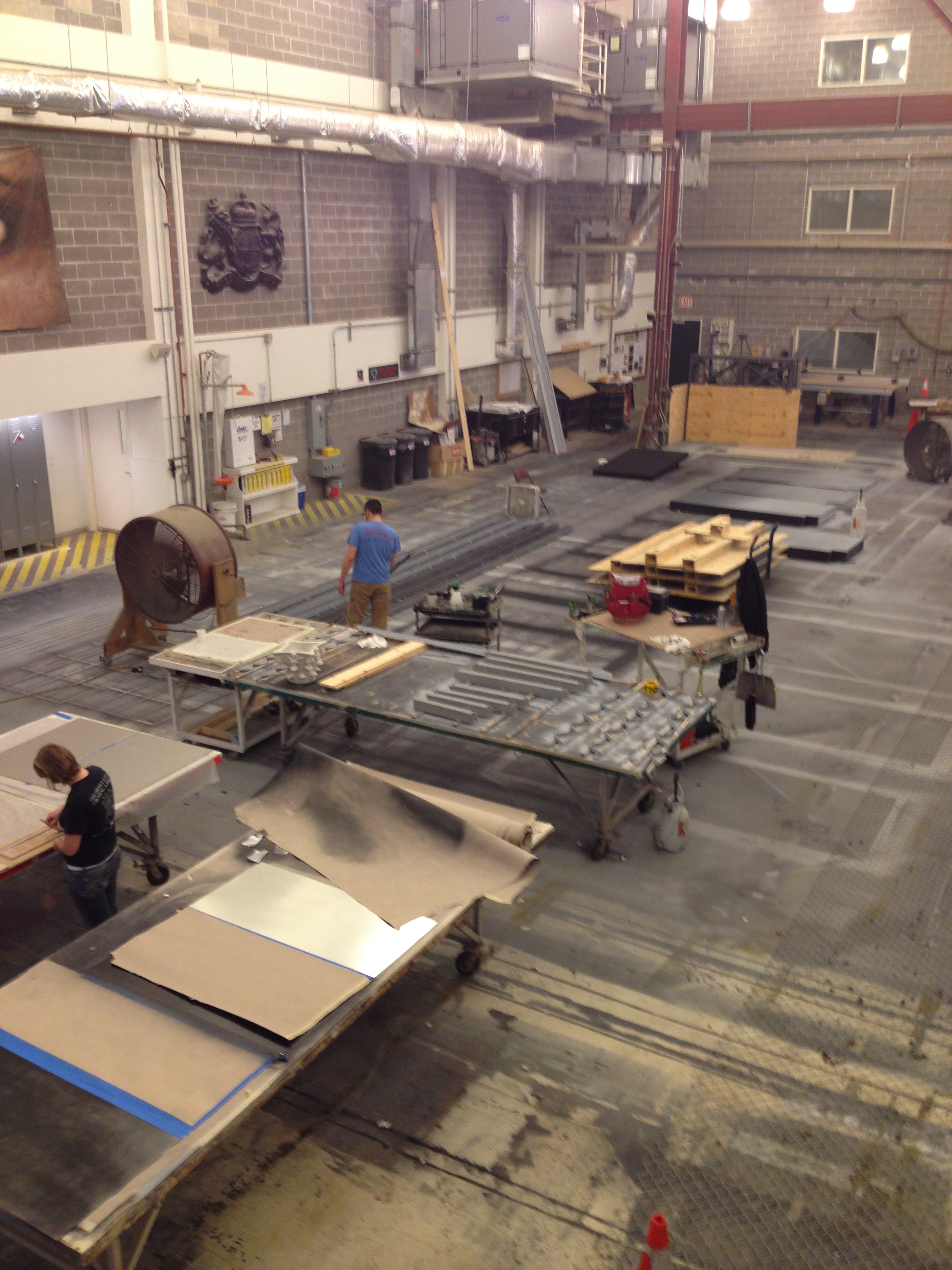 The Alley Theatre has a rather peculiar back-stage layout, in that the costume and set shops are on floors 14 – 18 of the parking garage building next door to the actual theatre building rather than in the basement of the theatre building. This is because when they had been in the basement, they were flooded ruining much of the stored costumes and sets. As the parking building hadn’t been fully completed yet, it was decided to turn the floors on the top of it into workspaces safe from any future flooding incidents (which occur more often here than in say London as result of occasional hurricanes or tropical storms that his Houston). This is the set shop on the 14th floor viewed from a storage gallery on the 15th floor: