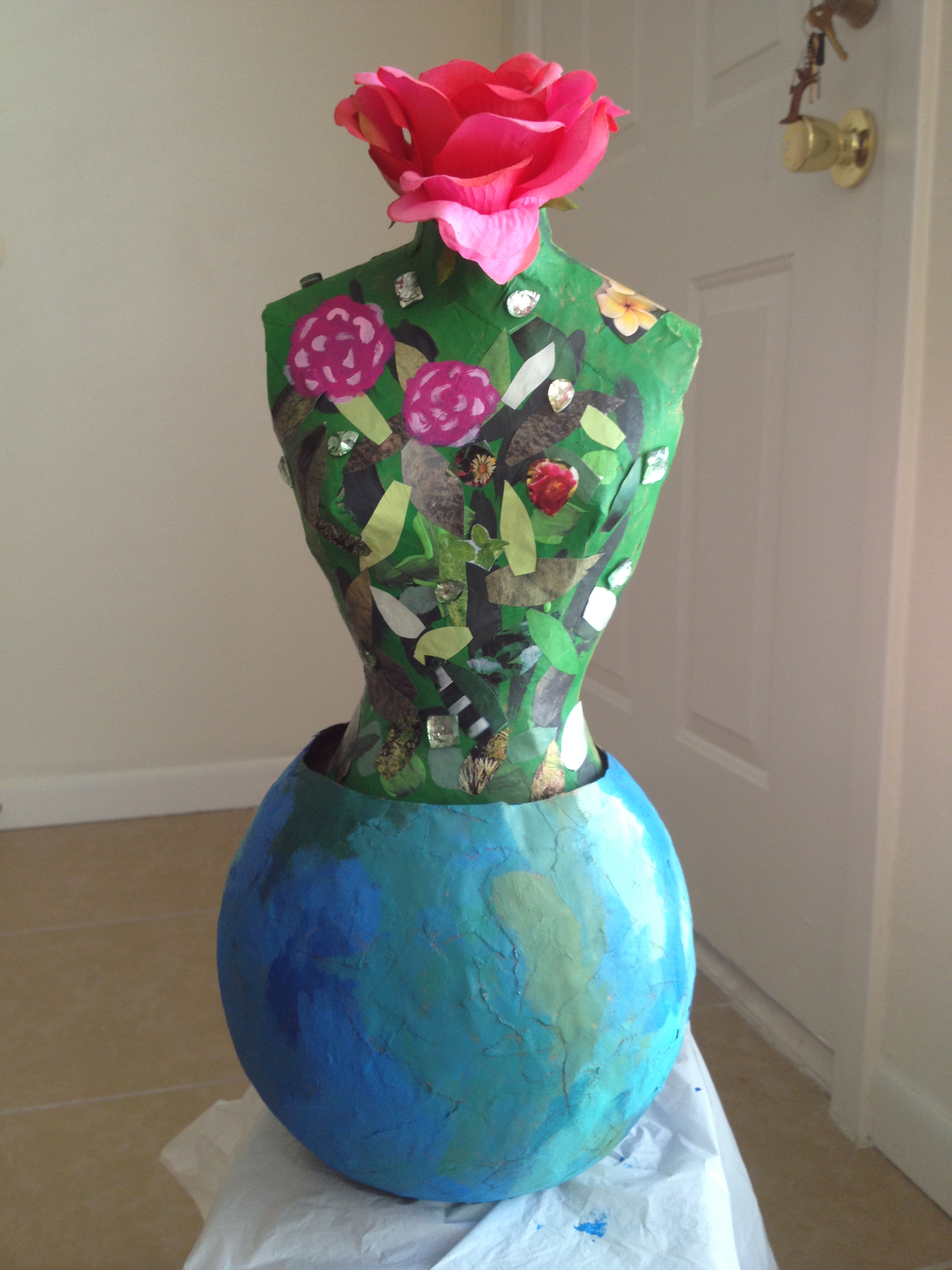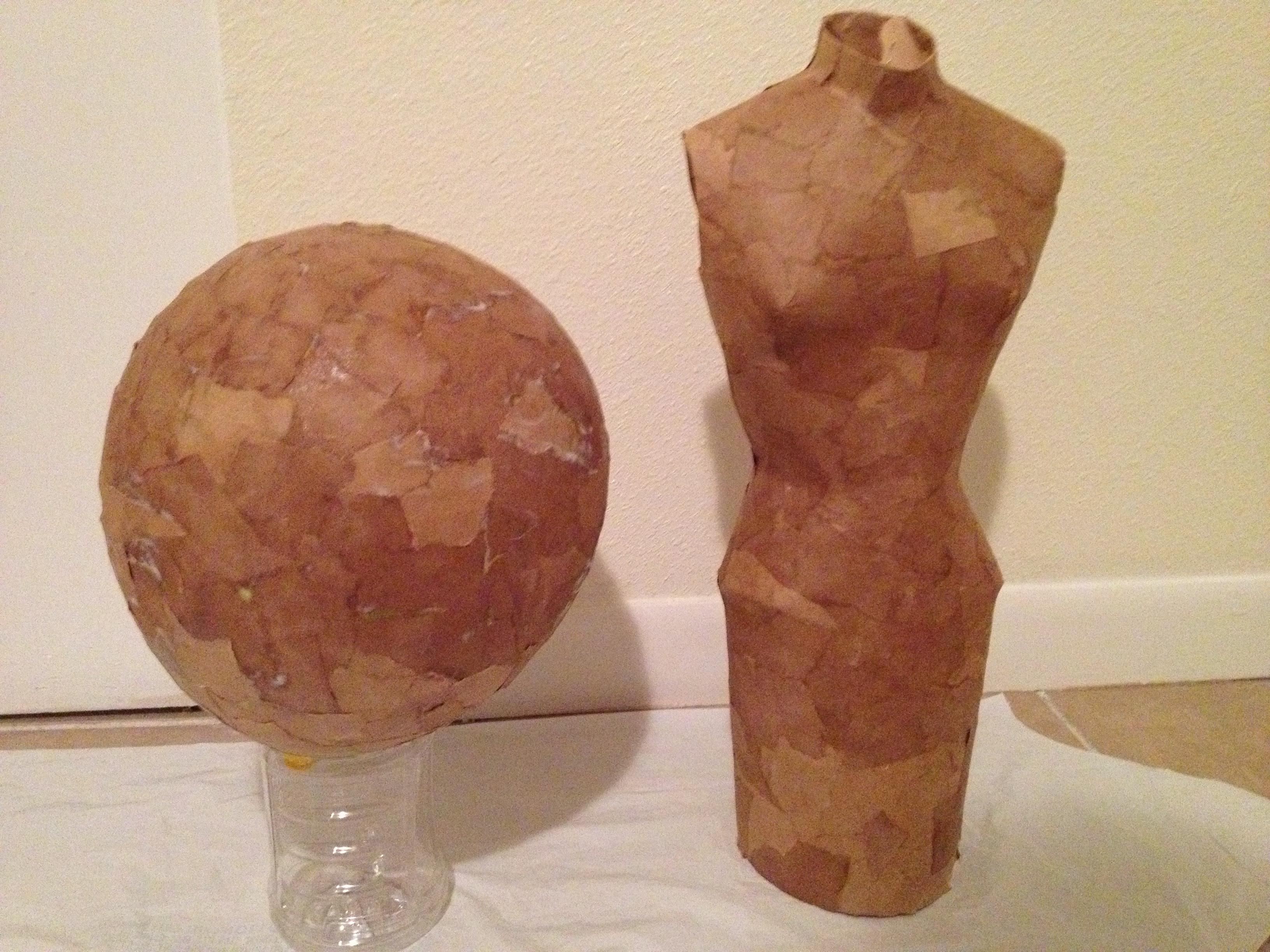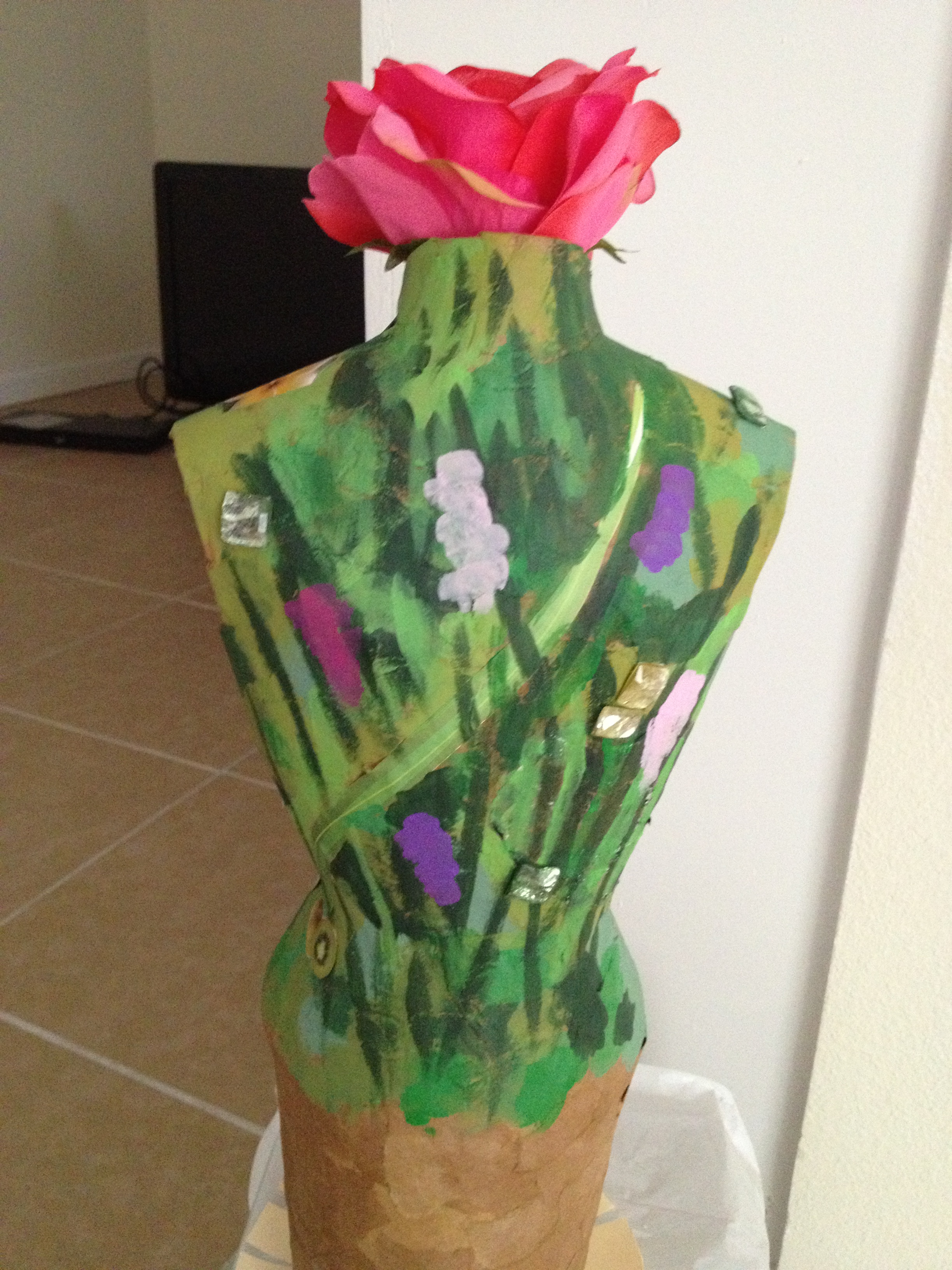 The mannequin was then covered in paper mache to create the shape and form each of us needed to appropriately reflect our chosen artist.  The mannequin was then to be ‘dressed’ in the fashion inspired by the artist, the fashion did not need to be wearable though.  The design could be even more ‘high fashion’ than Paris catwalks, where models often wear things that just cannot be worn anywhere else.  Here are the unpainted paper mache models I made: