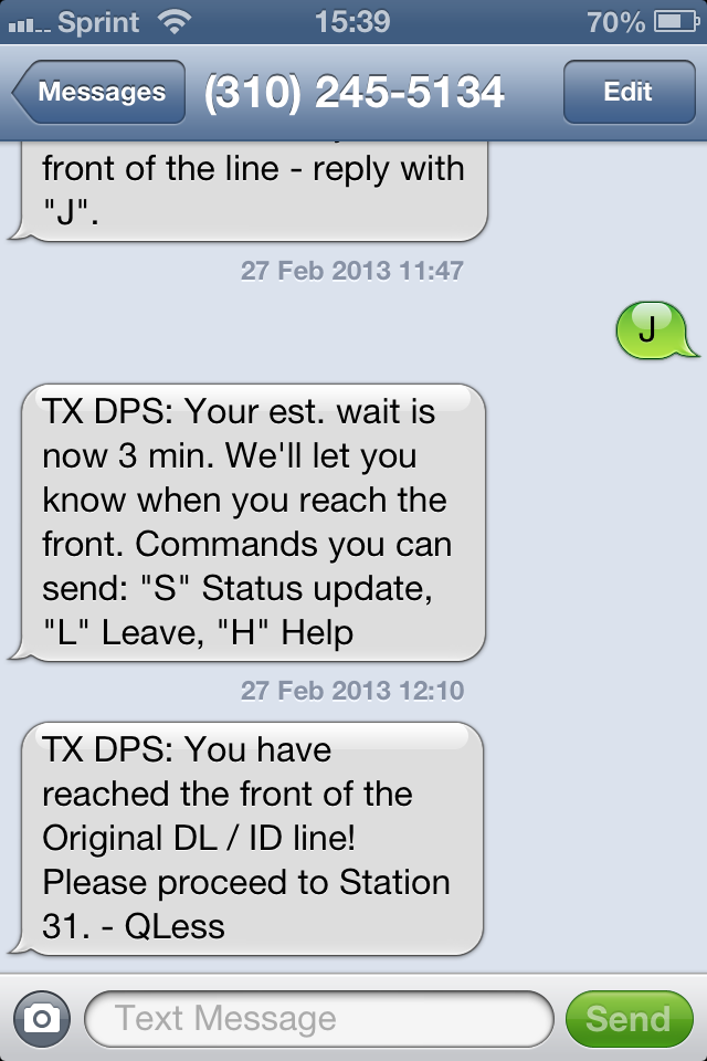 As my luck would have it, I was at the front of the line within 10 minutes of getting into it. Fortunately, the system allows you to get back into the line by text, which I duly did and I was at the front of the line in another 10 minutes. This time I left it a little longer to get back into the queue by text, and was once again at the front before Art was finished. I was a little nervous that it was just a morning lull, so I got back into the line once I was home from my morning at school and set out along the US59. Ten minutes later – a text. I glanced at my phone at a red light to see I was already at the front of the line again. Because I obviously don’t text and drive, I didn’t re-join the queue until I pulled up in the parking lot outside the DPS. I texted to join the queue and was second in line by the time I walked to the waiting area.