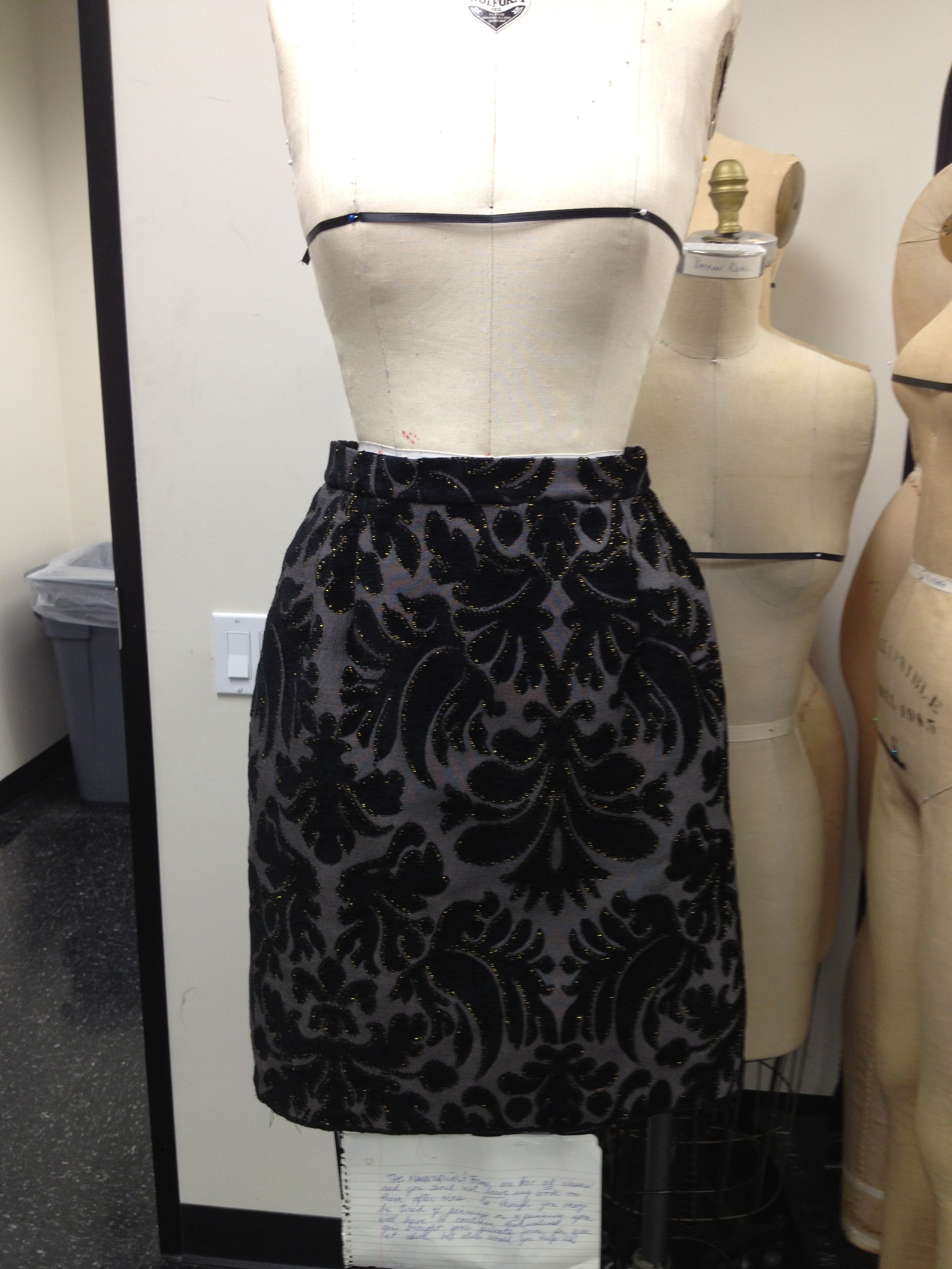 The first main project is the pencil skirt.  Our professor has shown us all the steps to make the skirt, from creating our own paper pattern from the school oak-tag, laying out the pattern on the fabric with the grain, how to tell which side is the right side of the fabric, cutting out the pieces, which edges to serge, which edges to stay stitch and the order in which to sew the necessary seams (darts, side seams, insert zip and rear seam, concentric lines on the waistband, attach waistband and blind hemstitch to hand finish the hem).  In between all of these of course the pressing, busting, trimming and grading of seams as relevant.  As was inevitably necessary he also demonstrated how to use a stitch-ripper effectively to remove seams which were not quite up to standard…