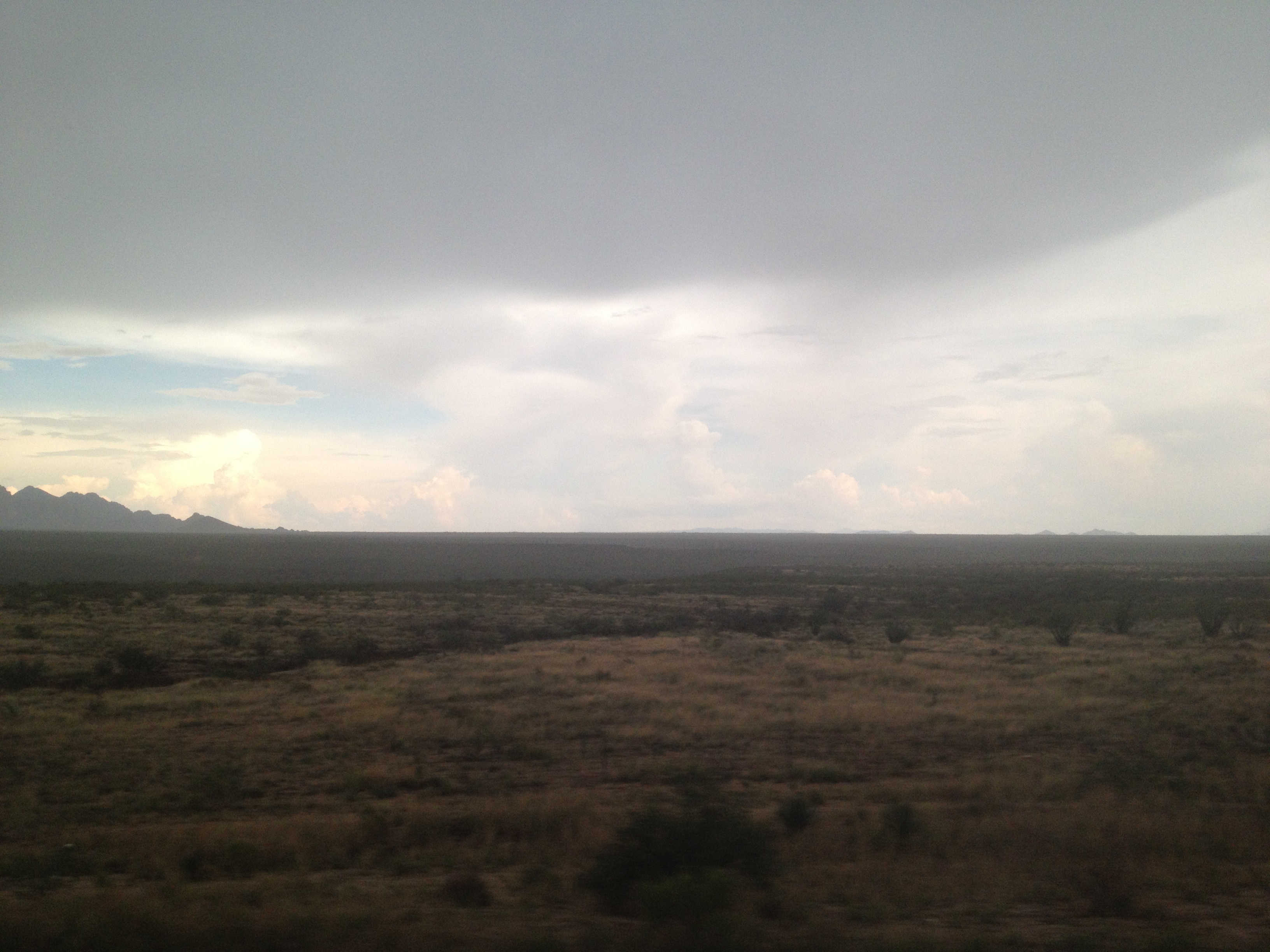 There must be something about me and deserts. When I went walking around the Sahara, we had a rain storm on the first night and thankfully were able to walk under overcast skies for the first few days. And now that I am spending a July afternoon crossing the state which boasts temperatures above 100° Fahrenheit (38° C) every day from May to October, am again under overcast skies and we had some rain along the way as well. More rain on the right side of the train than on the left. Which was odd.