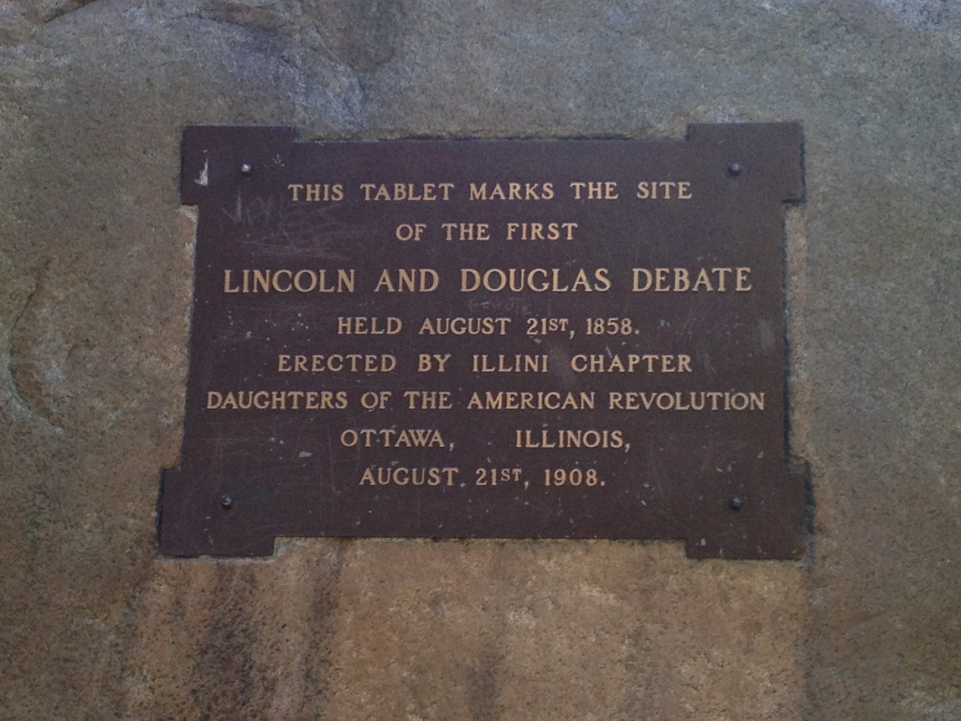 In the old town is Washington Square, where Abraham Lincoln (Rep.) and Stephen Douglas (Dem.) had their first of seven public debates when they were standing as candidates for Senator to represent Illinois. I liken this series of public debates to the presidential debates broadcast on national television these days, using the communication methods of their time. The statue above and plaque below commemorate this historic event.