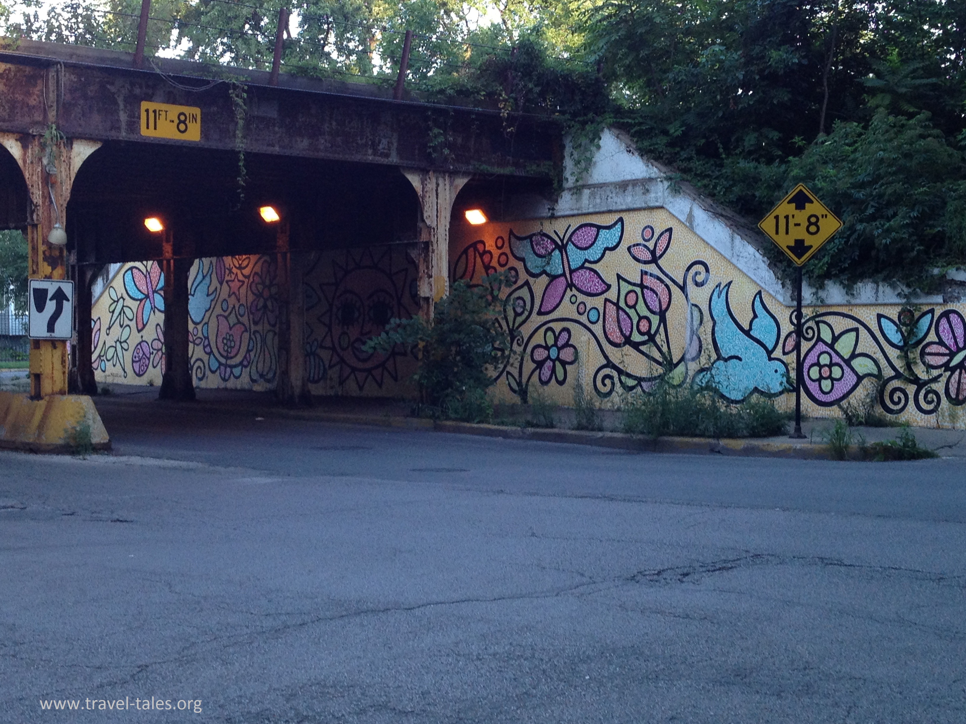 The tracks for the metra train connecting Evanston to central Chicago are raised around Roger’s Park. The concrete walls of the underpasses for roads crossing the tracks have been painted, each underpass having its own theme. I suppose that in addition to making them a less boring, they are also less vulnerable to tagging graffiti.