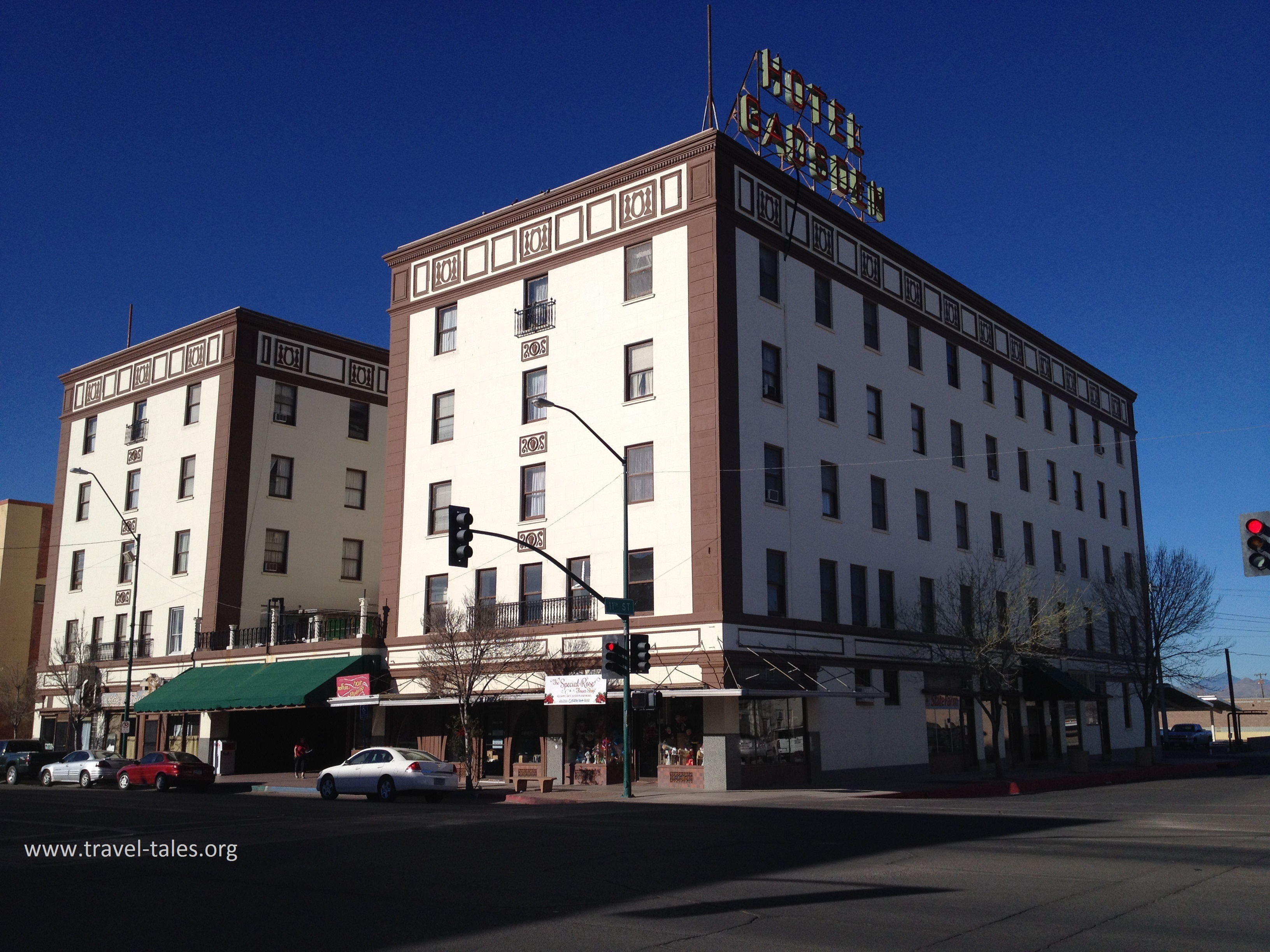 Douglas is one of the most southerly towns in Arizona, just a few miles from the border with Mexico. On its main street, G Street, stands the Gadsden Hotel which first opened in 1907. It was destroyed in a fire and rebuilt in the Art Nouveau style re-opening in 1929. It has a magnificent Tiffany stained glass window overlooking the lobby, which also has a sweeping staircase of Italian marble and gold leaf decorating the tops of the pillars.
