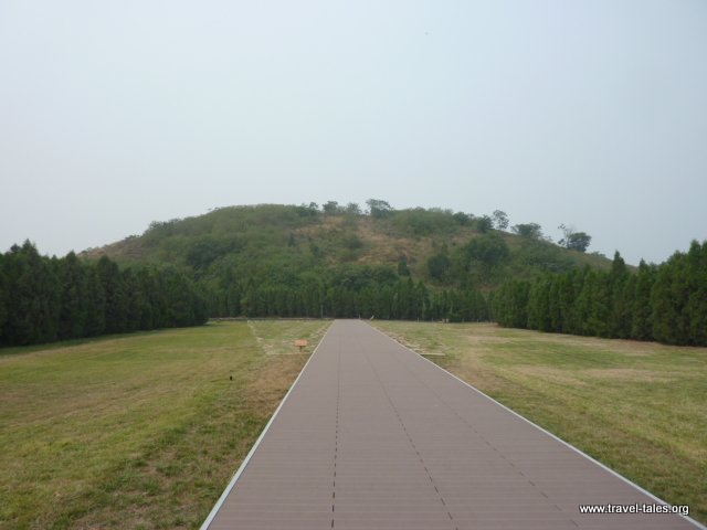 A brick chessboard and the biggest tile have been found at this site. The empress’ tomb is in the east, 450 meters away from the emperor’s tomb and is much smaller in comparison. It is also square, and is 350 meters in length. A wall made of pounded earth encircles the tomb, with four gates on each side. The underground chamber is also laid out like the Chinese character ‘ya’. The earth on top of the tomb measures 24.49 meters. Lots of outside pits have been found around it. In the 1990s, archaeologists excavated ten outside pits. Unearthed burial objects include naked pottery figurines, chariots and horses, weapons, articles of everyday use and a large number of pottery animals.