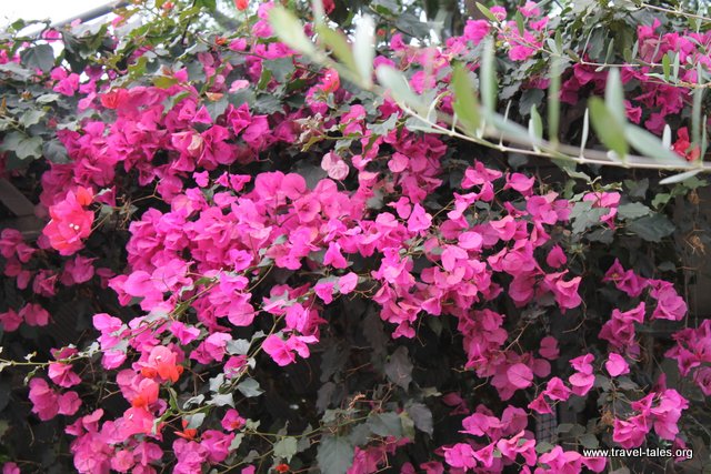 Overhead are wonderful bougainvillea flowers and other pink blossoms alongside the path.