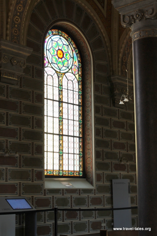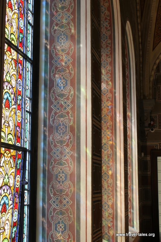 The interior walls and ceilings are beautifully decorated, creating a stunning setting for the stained glass windows.