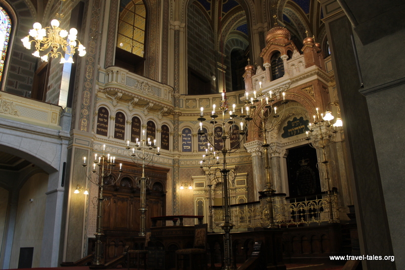 Clearly identifiable from the outside by the star of David on the spires and the central window, the Great Synagogue in Plzen presents the ten commandments on tablets over its central entrance.