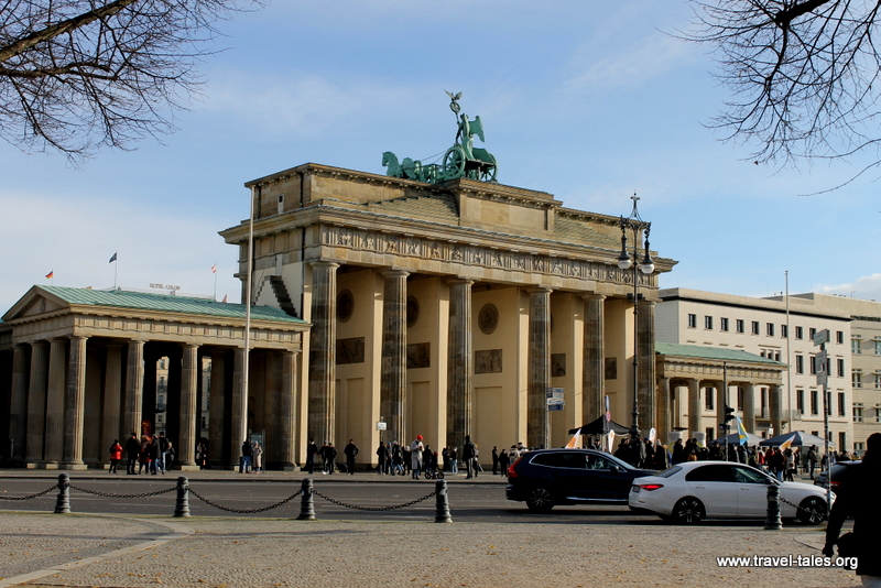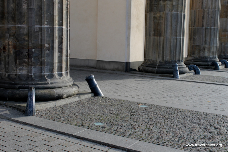 The most famous gate, and the only one still remaining, is the Brandenburg Gate, which sits at the end of the boulevard Unter den Linden and opens up onto the Tiergarten park from the city centre. The word for “animal” (tier) in the name of the park comes from its origin as a hunting ground and should not be confused with the zoo. The Reichstags building was built on the then edge of Berlin with views over the Tiergarten, so the famous gate is merely walking distance from the parliament. Whether the bollards have ended up this way or were designed to be at an angle is unclear.