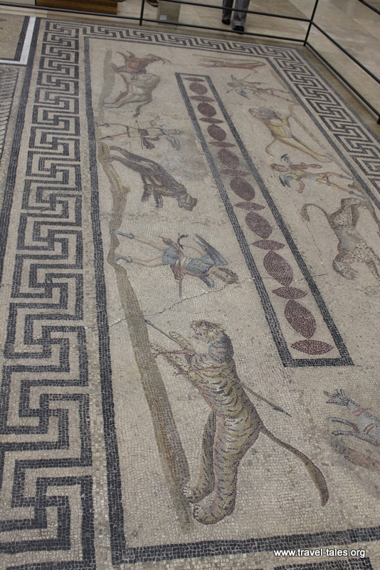 On entering the room through the gate, a large Orpheus floor mosaic comes into view, also found at Miletus. It was easiest to photograph up side down because unsurprisingly, more people were standing at the foot of the image! Even though upside down here, you can see the central image of the bard Orpheus playing his lyre surrounded by images of the animals he is charming with his signing.