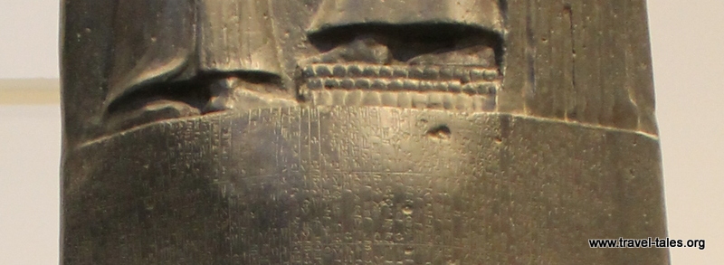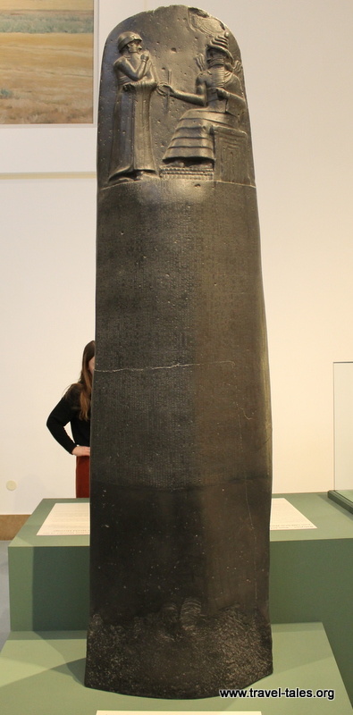 In the upright picture you can get a sense of its size from the woman standing not far behind it, the horizontal picture gives an indication of how small the cuneiform script is in which 282 laws have been carved. Hammurapi’s reign was from 1792 – 1750 BCE and one of his significant achievements in this time was documenting oral law in written form.