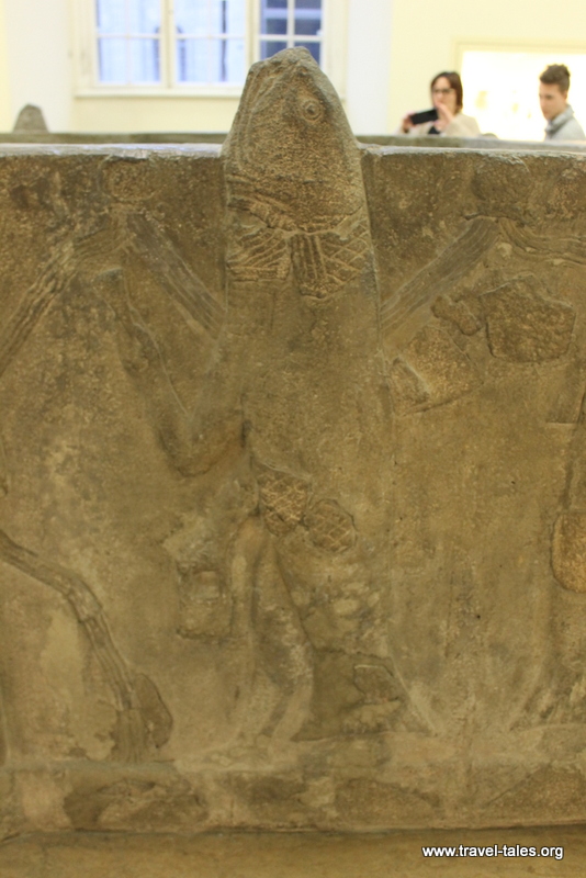 There is also a modern reconstruction of the façade of a temple to Inanna and a large water container. The content of the latter is clear from the fish on its side, I’m less sure whether it was for keeping drinking water, for bathing or to keep fish for fun or consumption.