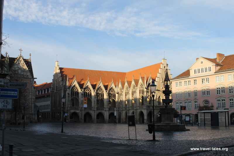 A half-timbered customs house, originally built in 1643 was reconstructed on the corner of the Gewandhaus from 1948 – 50. Much of central Braunschweig suffered bomb damage in the Second World War, so rebuilding bomb damage with preservation-worthy buildings was attractive.