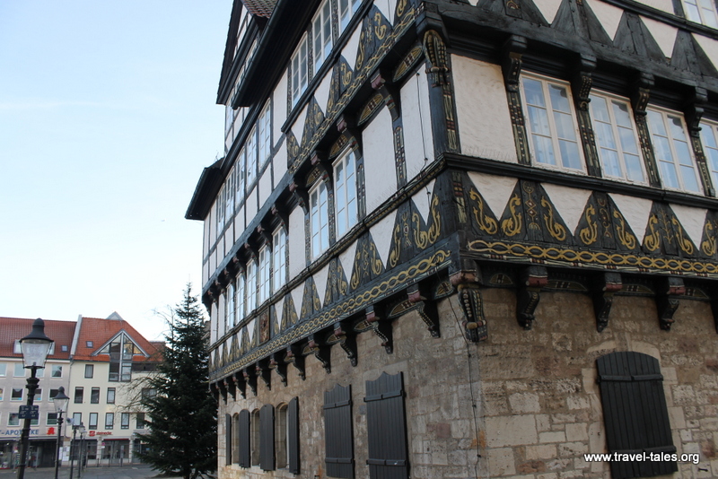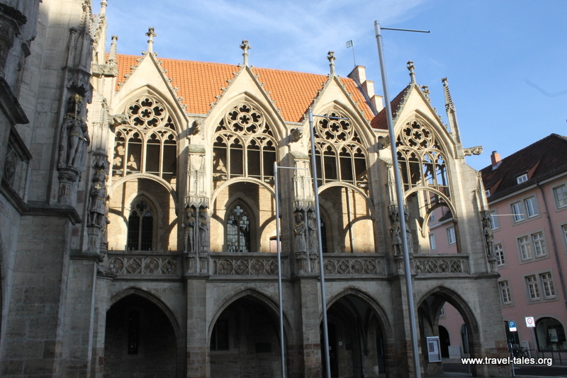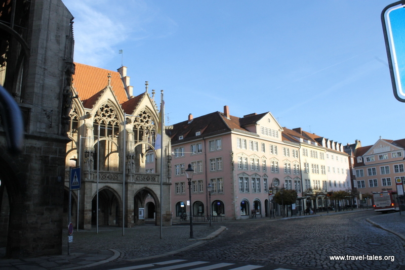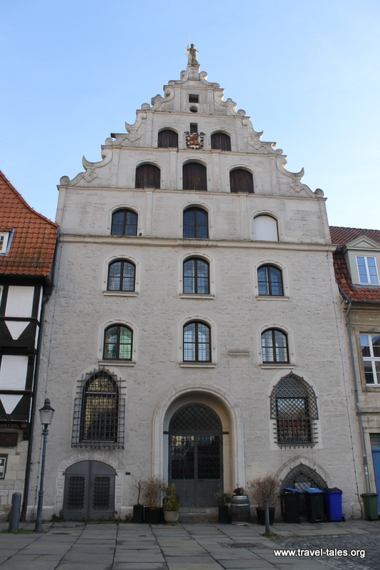 The south side of the square consists of a long, single building, quite boring looking and covered in scaffolding, which is why I did not take any pictures of it. I did of its west and east facades, without realising the importance of the building they flank. It is the Gewandhaus, “Garment House”, the home and store for the textiles sold in the market. To ensure fair trading, the official “Braunschweiger Elle” was embedded in a pillar of the Town Hall on the north side of the market. The standard ell by which anything sold by length in the market was to be measured with. It is now the home to the local Chamber of Commerce.