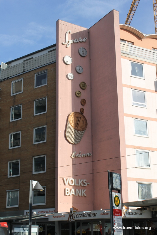 The bank outside which the tall pencils stand advertises itself in the middle of the town with encouragement to locals to save their money there. Clearly before the introduction of the Euro, I recognise the designs of some of the Mark and Pfennig coins.