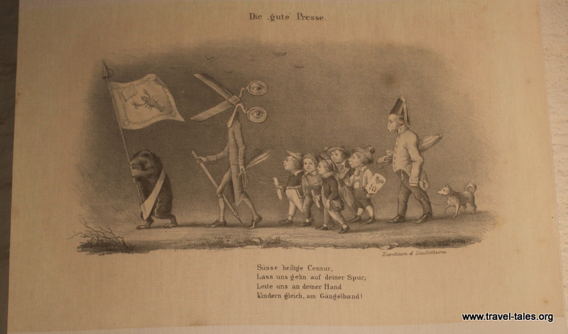 The increase in newspaper frequencies and publishers created a desire for censorship, as rulers became uncomfortable with what was being printed. The perception of how editors were just following censors, who cut publications with their scissors, was satirised in 1847 in the Leuchtturm magazine.