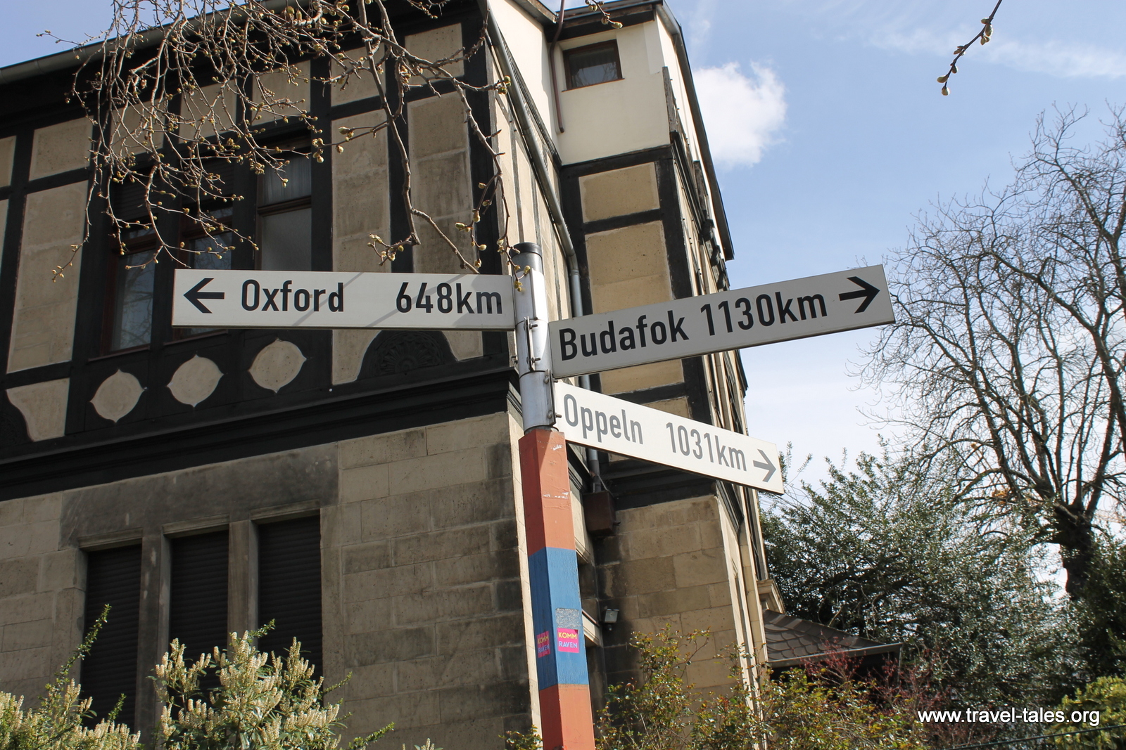 The next stop on my journey was well signposted in Bonn. Next to this post pointing at the three partner cities is a well-known sight to English residents, a red telephone box full of books!