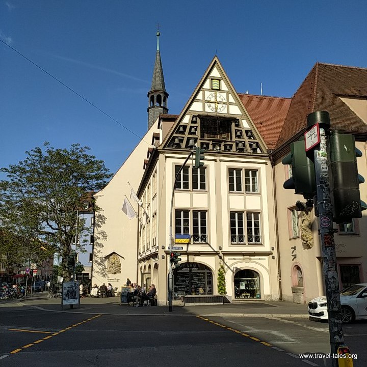 The impression walking around the city now is that it suffered little damage in World War II. The sign on this building shows that much of this is down to significant rebuilding work which took place in the second half of the 20th century, albeit retaining the older style of buildings. It states that after its complete destruction on 16 March 1945, the building was rebuilt and decorated in 1965.