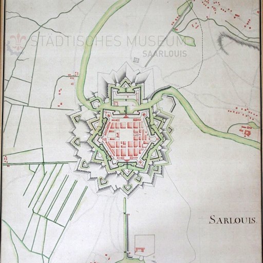 The location of this fortress town was on the river Sarre (spelt ‘Saar’ in German) and it was reverently named after the king: Sarre-Louis. The design of the fortress was similar to others Vauban built (33 in total). A star-shaped fortress around a large parade square.