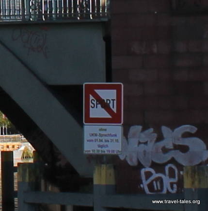 We needed to make sure that we reached this particular bridge in time that morning. As the close-up of the sign shows, as sports boaters without a built-in VHF radio, we would not be permitted past this point after 10:30am.