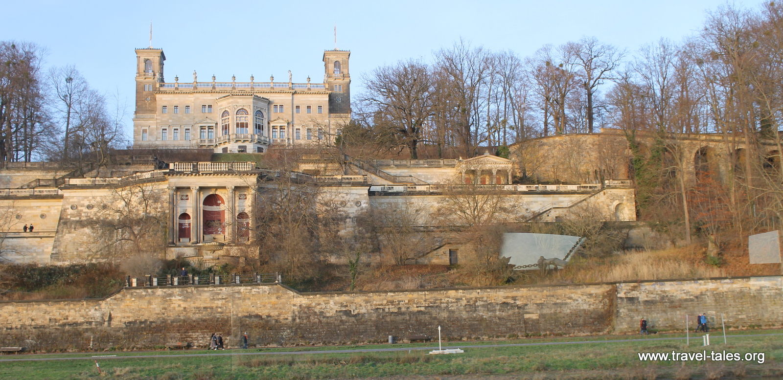 Travelling upriver, we passed the Schloss Albrechtsberg first. It was commissioned in 1850 by the Prince Albrecht of Prussia. The steep banks of the river needed to be reinforced to enable the construction at the top of the hill. The terracing down the side of the hill sought to emulate Italian palaces, may also contribute to the stabilisation. The building was completed in 1854. As money had run out, not all aspects of the original design were built.