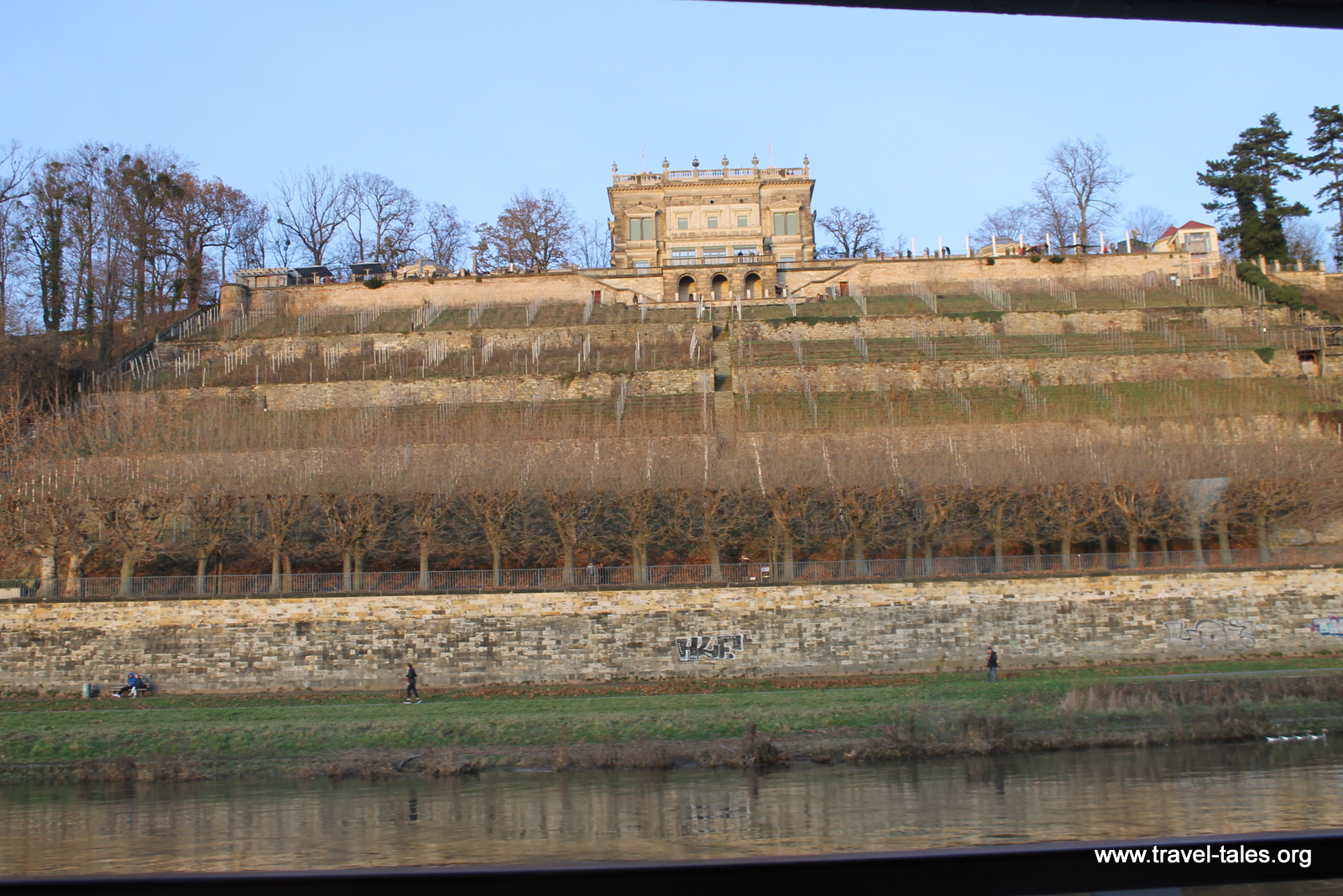 Having passed under this bridge we saw one of the main attractions of this particular cruise, the three palaces. Rowed up on the north side of the river are three palaces, often referred to as the Elbschlösser – Elbe Palaces.