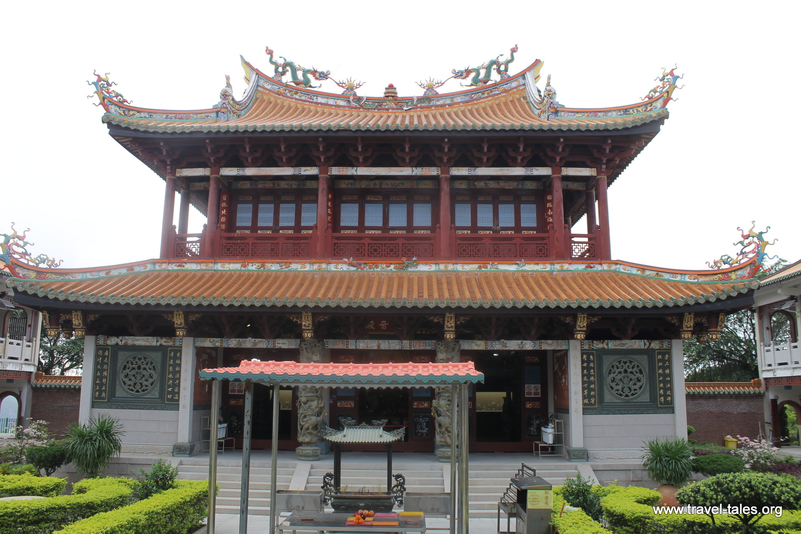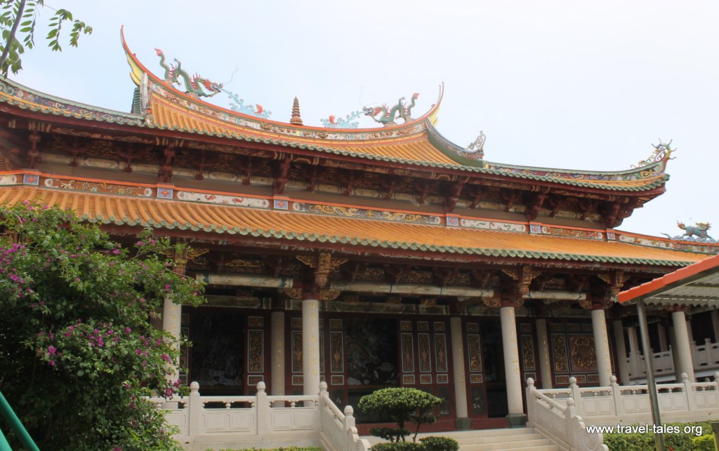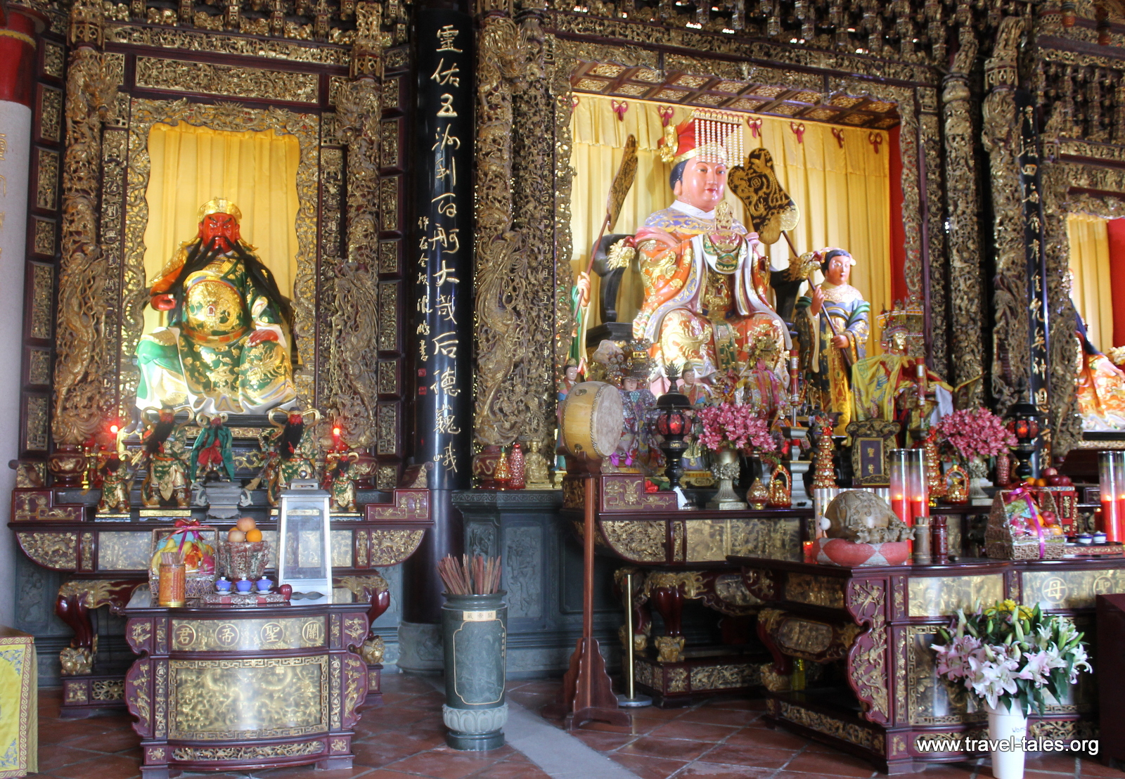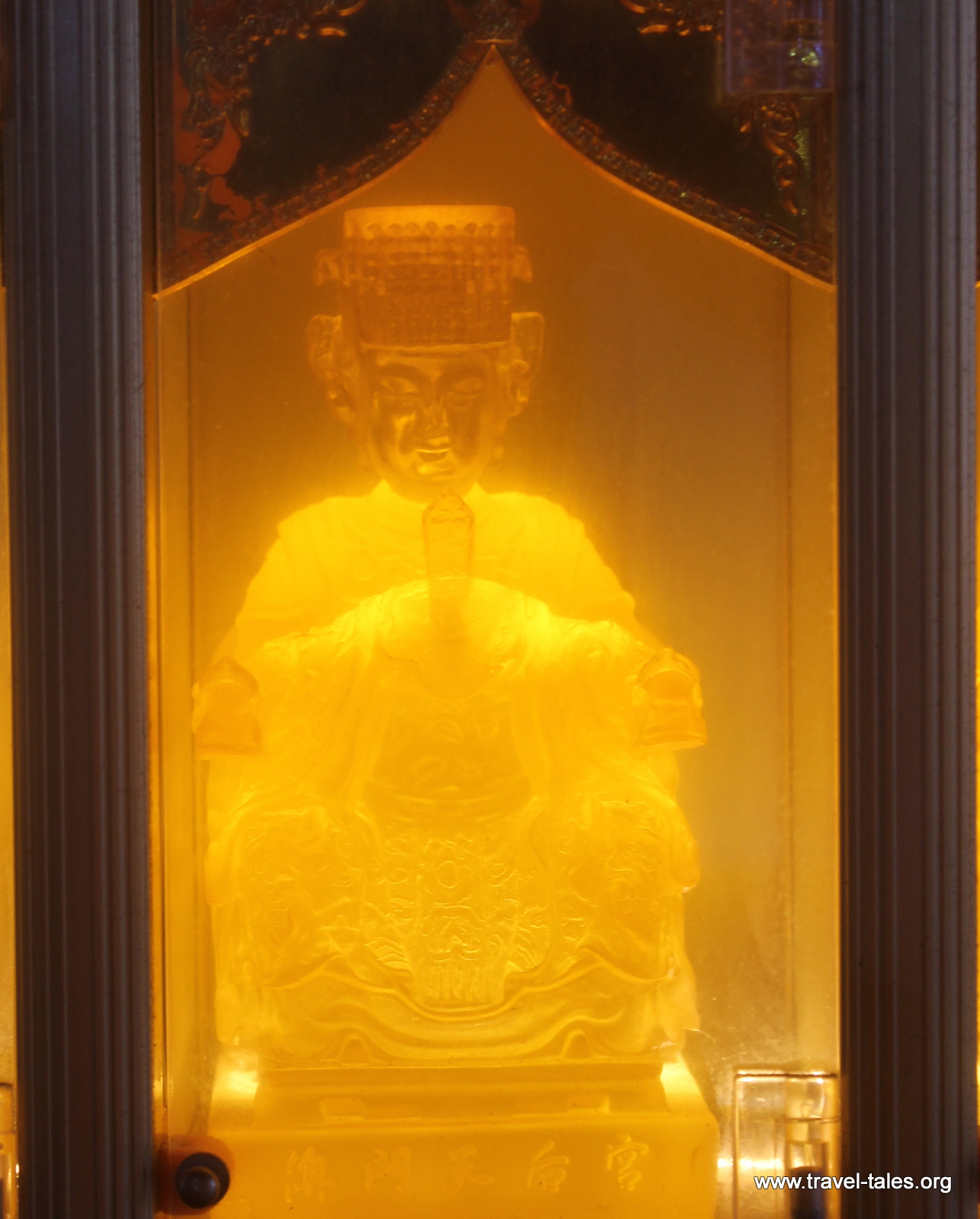 Around the first temple behind the altar, the Tianhou Temple, typical red Chinese lanterns hang from the roof. It is home to this large figure of a god, I am unsure which one. Along the walls, there are little figurines, some lit others not. I suspect one can make an offering to the temple which is recognised in the lighting of a figurine. Even from behind, it is an impressive building.